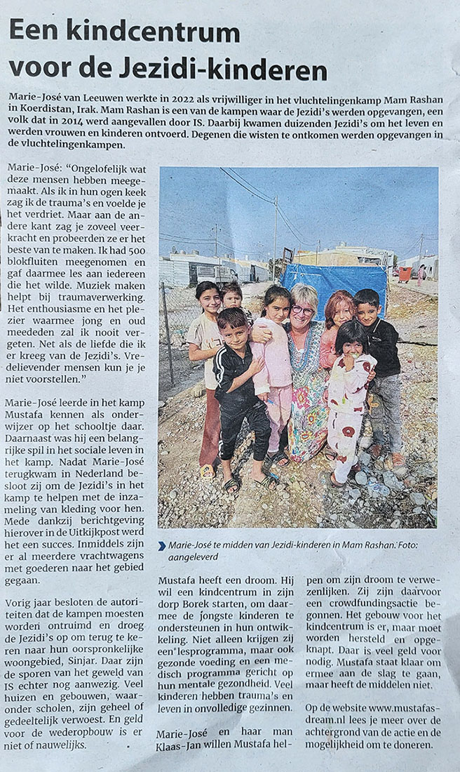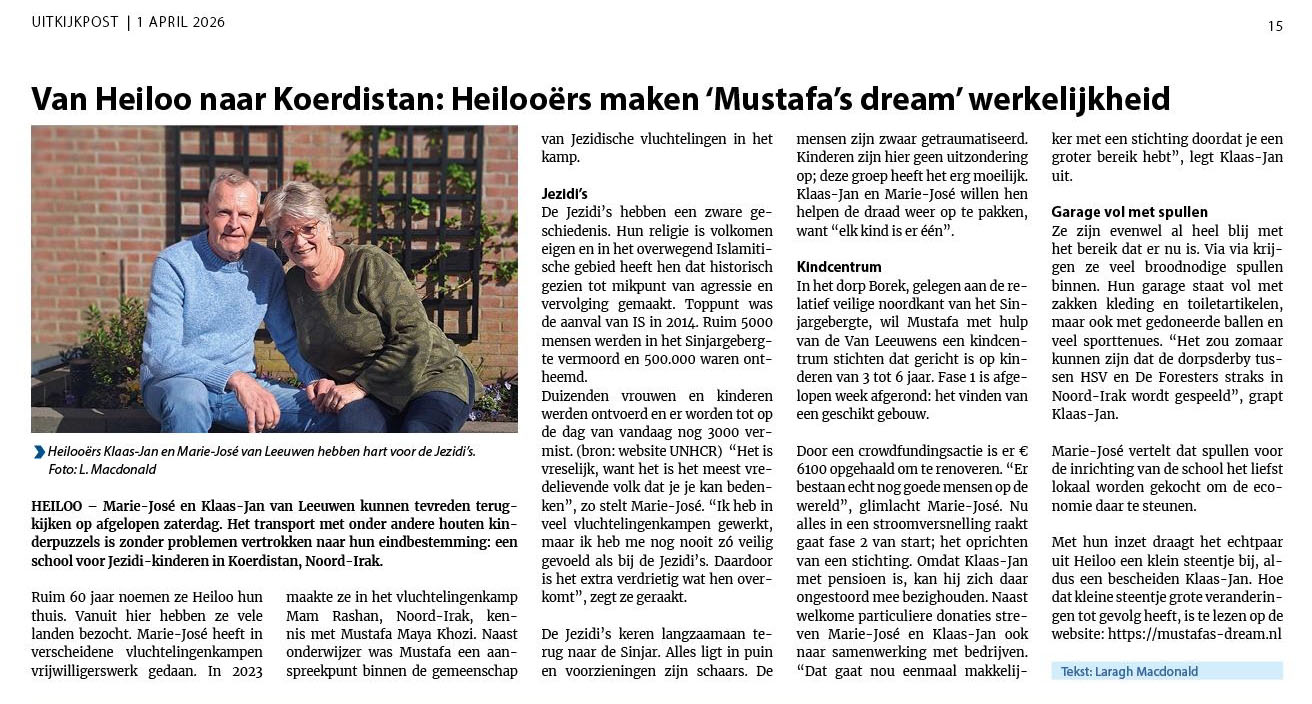 In de uitkijkpost van 1 april 2026 werd een artikel gewijd aan de status van het project "Mustafa's Dream" van Marie-José en Klaas-Jan voor de Jezidi kinderen in Irak. De eerste stap om een gebouw te vinden is genomen. De meest spullen voor het kindcentrum worden lokaal in Irak gekocht.